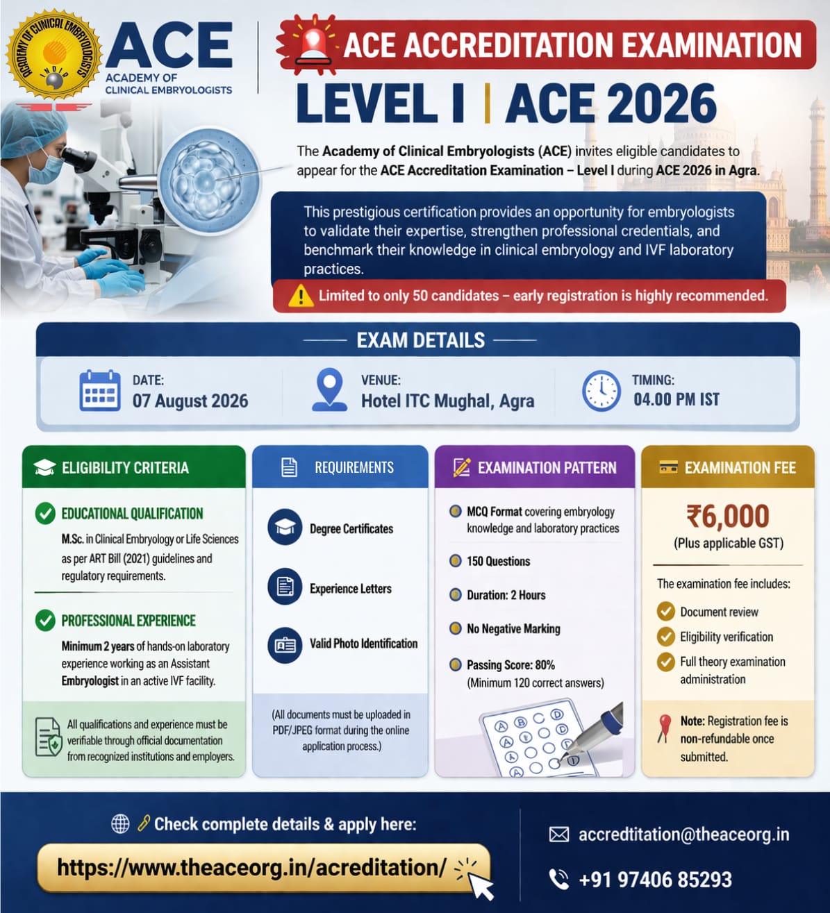 The Academy of Clinical Embryologists (ACE) invites eligible candidates to appear for the ACE Accreditation Examination – Level I during ACE 2026 in Agra.This prestigious certification provides an opportunity for embryologists to validate their expertise, strengthen professional credentials, and benchmark their knowledge in clinical embryology and IVF laboratory practices.